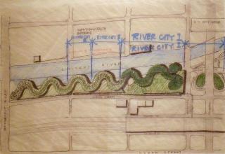 RIVER CITY CHICAGO, IL Project perspective Blueline print with tissue overlay colored with marker and colored pencil. Undated - Circa 1975 11 x 17 inches |